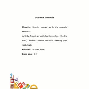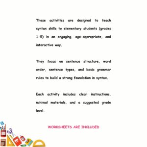 Syntax, the arrangement of words to form meaningful sentences, is crucial for learning proper English. It governs how words combine to convey clear ideas, ensuring effective communication. Proper syntax enhances comprehension, allowing learners to express thoughts accurately and understand others. It provides structure, distinguishing coherent sentences from jumbled ones. For non-native speakers, mastering syntax builds confidence in speaking and writing, reducing misunderstandings. It also aids in grasping nuances, such as tense or mood, vital for fluency. By studying syntax, learners internalize rules, enabling natural, precise, and impactful use of English in diverse contexts. This resource contains 8 syntax activities to enhance writing skills of elementary students.